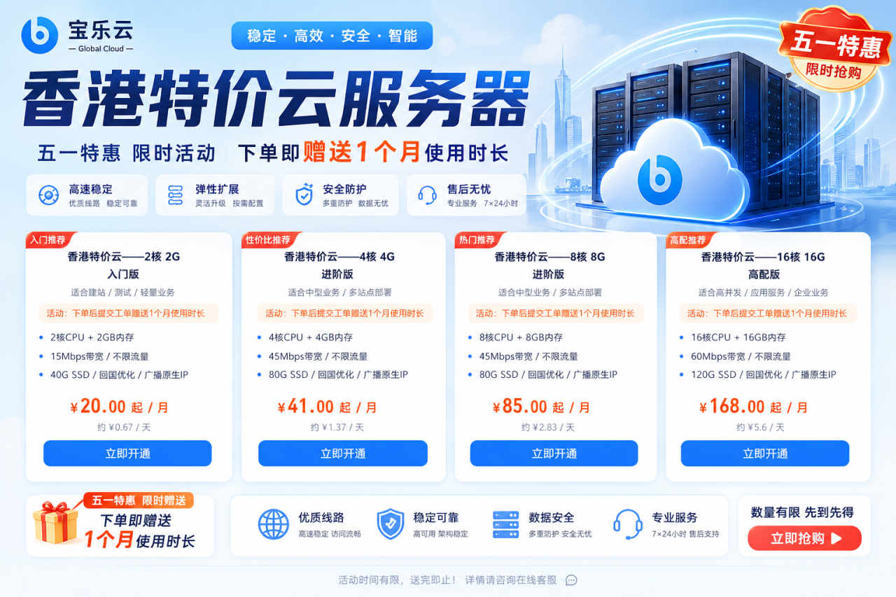 这次实测了一款目前性价比非常高的香港云产品——宝乐云香港特价云,正好赶上五一活动,价格确实有点狠。